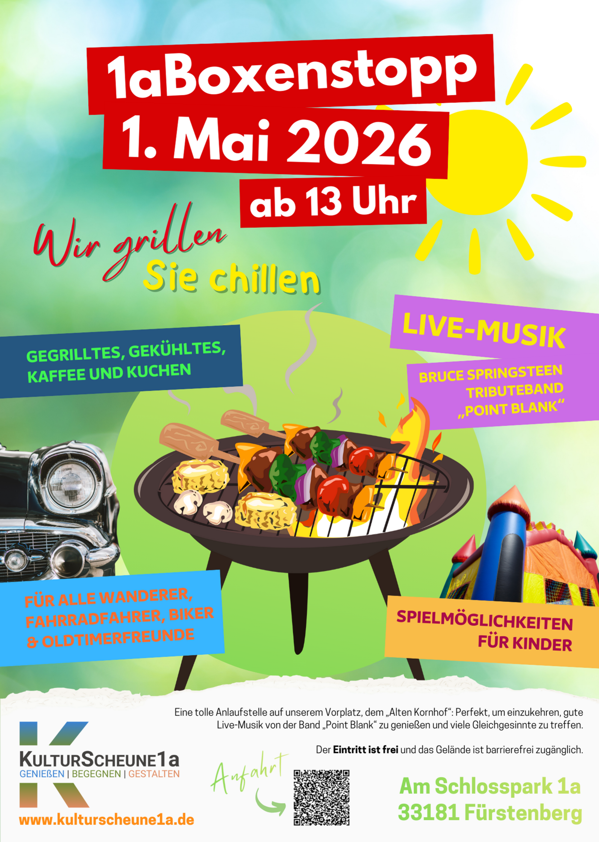 Auch in diesem Jahr gibt es bei der KulturScheune1a eine Anlaufstelle, um einzukehren, gute Live-Musik zu genießen und viele Gleichgesinnte zu treffen. In diesem Jahr wird "Point Blank", die Bruce Springsteen Tributeband aus Nieheim den Vorplatz rocken.