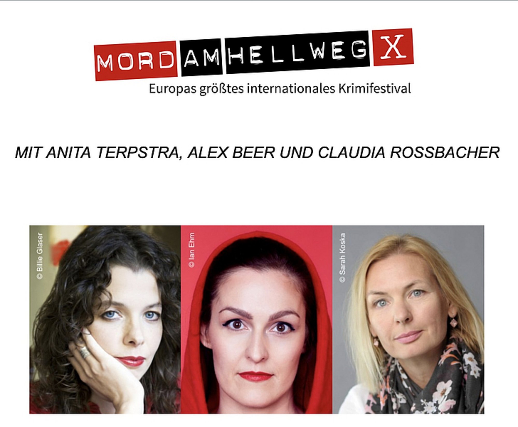 Geballte mörderische Frauenpower! An diesem Abend präsentieren gleich drei Krimiautorinnen ihre neuesten Verbrechen: Die österreichische Bestsellerautorin Alex Beer (2020 mit dem bedeutenden Publikumspreis „Mimi“ und dem Österreichischen Krimipreis ausgezeichnet) hat ihren aktuellen Krimi im Gepäck. Und auch die österreichische Autorin Claudia Rossbacher, die 2020 mit ihren Steirerkrimis (fürs ZDF mehrfach verfilmt) ihr zehntes Jubiläum feierte, präsentiert ihr aktuelles Buch. Die dritte Krimidame im Bunde, die hierzulande für ihre außergewöhnlichen (Psycho-)Thriller bekannte Niederländerin Anita Terpstra, verspricht Nervenkitzel und Gänsehautmomente auch ohne viel Blutvergießen. Freuen sie sich auf ein hochkarätiges Krimierlebnis! Musik: Hellweg-Crime-Trio. Moderation: Alexa Christ (u.a. Deutschlandfunk, WDR). Deutsche Lesestimme: N.N.